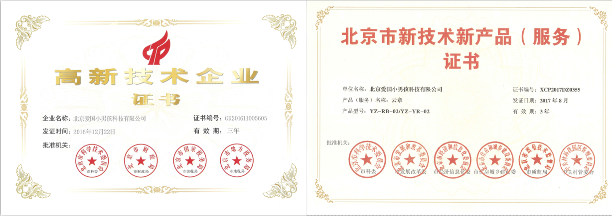 “國家高新技術企業”稱號、“新技術新產品(服務)”證書。自主研發的國內首款物聯網智能印章管理產品—云章,實現了政府企業公章與管理者之間的信息交換和即時通信,杜絕公章被盜用、濫用,在保障用章安全的同時降低用章成本,提升政府企業管理效率。