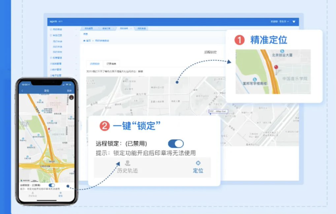 智能云章配備北斗導(dǎo)航定位系統(tǒng),使管理者隨時隨地查看印章使用記錄、活動軌跡。當(dāng)監(jiān)測到異常蓋章情況時,管理者可在線上點擊“遠(yuǎn)程鎖定”按鈕,及時防止違規(guī)用印行為。