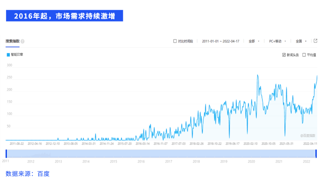 從2016年起,市場用戶對智能印章的關注度逐年增加。截至2022年4月,智能印章搜索指數增長了5倍,每月實有市場主體增速穩定在12%以上。