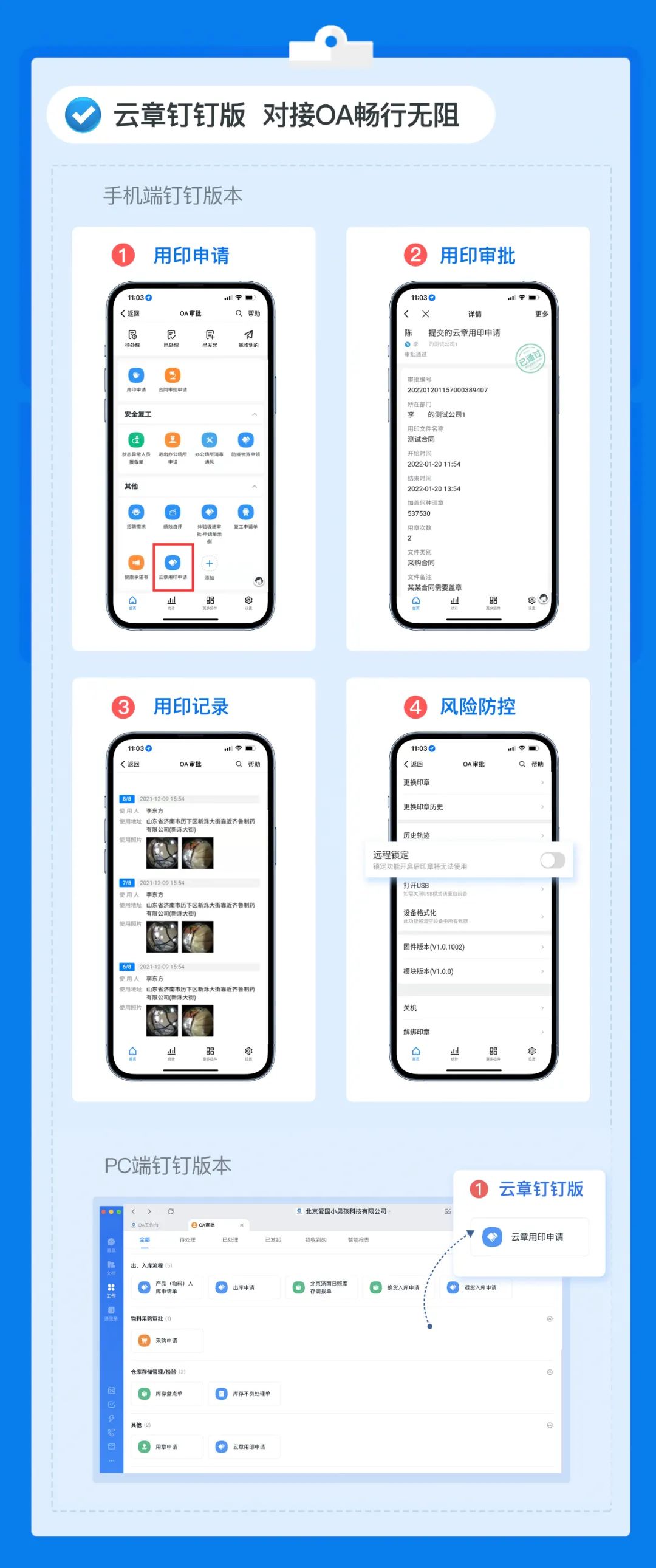 對接智能云章系統,就能在企業的OA系統中發起蓋章申請、快速審批,統籌協調人事、行政、出勤、休假、采購、出入庫等業務的用印審批。