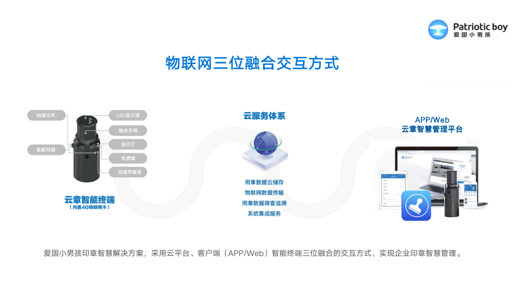 愛國小男孩智慧印章產品體系由“智能云章、電子簽章、云章柜、印控機系列、蓋章機系列”構成,為政企單位、企業集團、組織團體提供“實體印章管理、電子印章、印控系統、身份認證、數據存儲、自動化蓋章、批量蓋章”等服務。