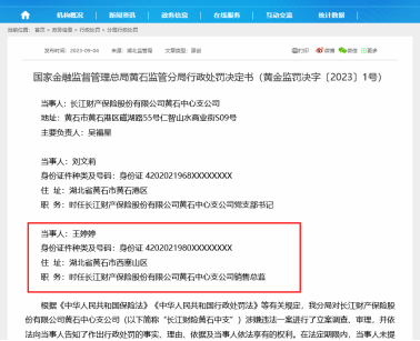 9月4日,國家金融監督管理總局官網發布信息長江財產保險股份有限公司黃石中心支公司原銷售總監王婷婷私刻公章、騙取客戶資金,被終身禁止進入保險業。