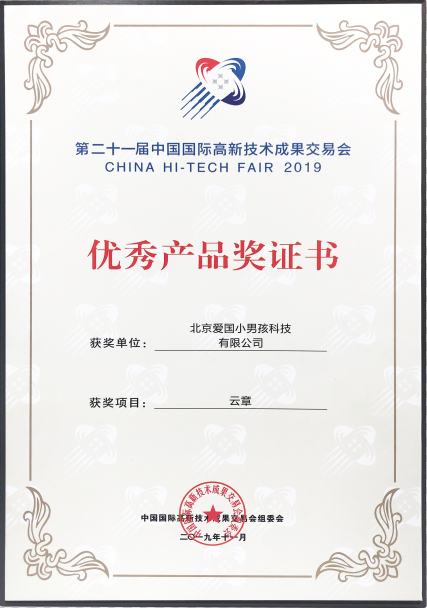 愛國小男孩科技作為受邀展商之一,在高交會現場展示了智能用章解決方案云章產品,受到了參展商、媒體及現場觀眾的高度關注。并憑其獨特的設計理念,獲得第21屆高交會“優秀產品獎”證書。
