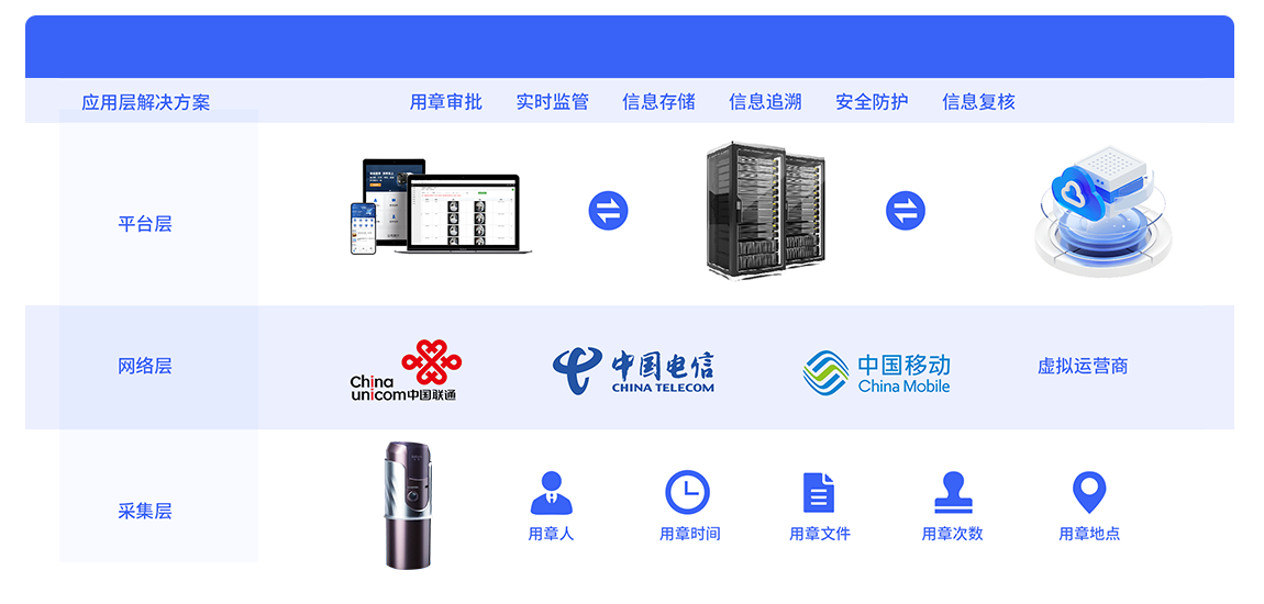 云章采用云平臺、客戶端(手機App和Web)及智能終端三位融合的交互方式,通過鏡頭記錄每一次蓋章的過程:使用人、對象、時間、地點,通過4G物聯網將以上用章信息發送給管理者,確保用印過程可防控、可監管、可查詢、可追溯,能解放印章管理者工作壓力,降低風險。